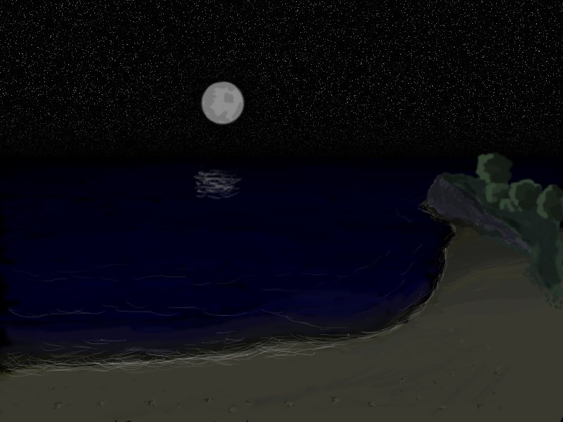 Moon, Stars, Beach, Water, Bush, Rock Cliff for first