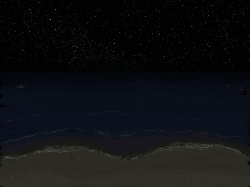 Stars, Beach, Water, Boat(?) on left, Red and Green Buoys(?) on the right for the second