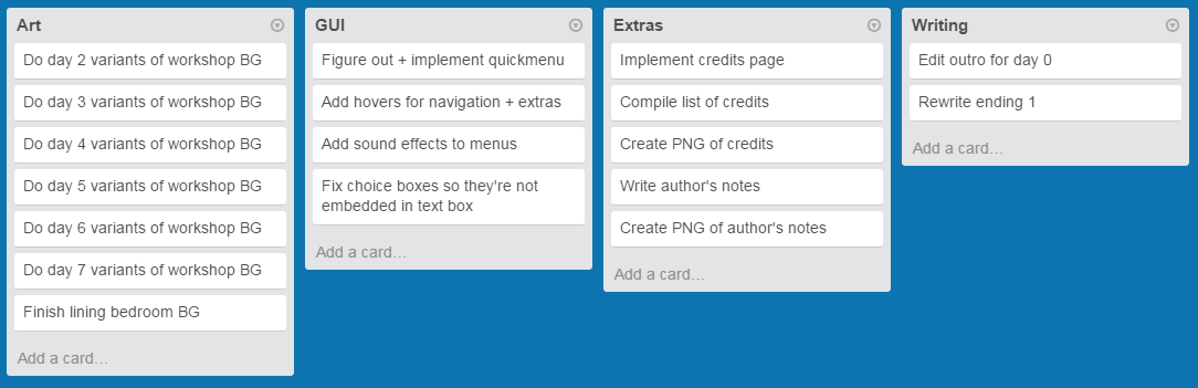 I have a whiteboard where I write down important notes, names of .mp3 files, general mapping of the storyboard. It also has a checkbox of things I have to accomplish within the month.